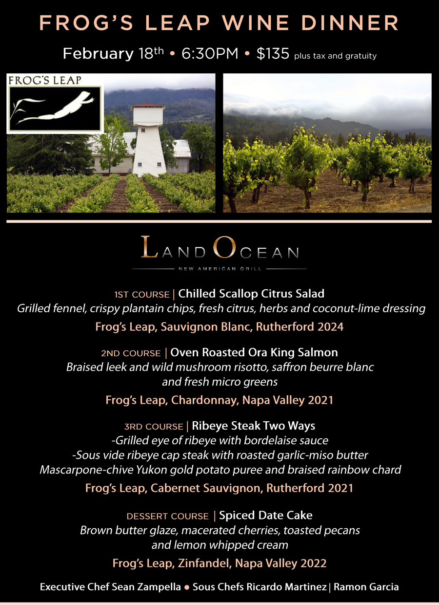 Experience an evening of elevated dining at Land Ocean Restaurants. Our tasting dinners feature thoughtfully crafted multi-course menus that highlight premium ingredients, bold flavors, and creative culinary pairings. From exceptional wines to distinctive spirits, each event offers a memorable night for guests who appreciate great food and great company.